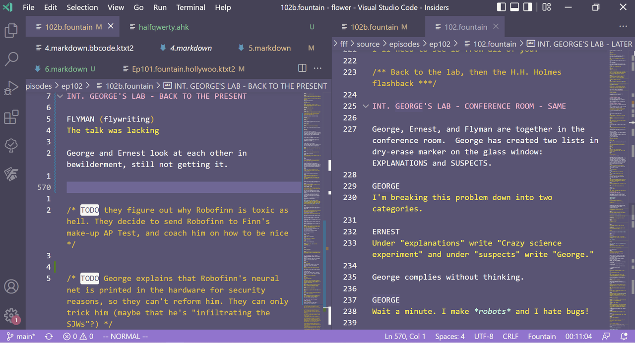 I write my screenplays in Fountain, a plaintext language, as a result of I would like each one in all my tasks to be model managed and proprietary scriptwriting applications like Scrivener and Final Draft, whereas cool, use non-portable codecs that do not model management as effectively. Plus, I can do my writing in Visual Studio Code, which has the massive benefit that I can prolong it with my very own plugins. (When I began this venture, the Fountain information have been truly exported from an Emacs org mode file, which is an extended story.)