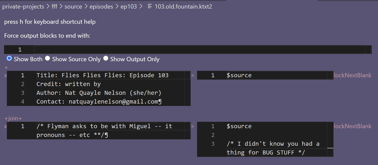 For rewriting episode 3, I made a decision to strive utilizing the customized VSCode plugin that I applied for the larger objective of changing the Fountain scripts to “sport” code. (I feel introducing this plugin will make extra sense if I begin with the instance of rewriting a script earlier than I clarify that fountain->code conversion course of.)