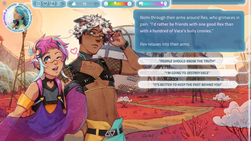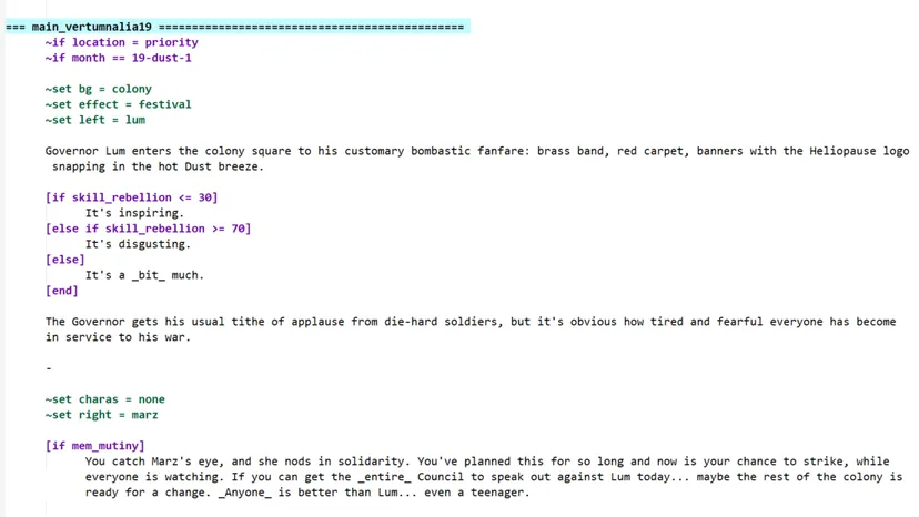The simplicity of Exoscript was a aid given how a lot we needed to maintain observe of. Generally, our system was: I blocked occasions out, Lindsay wrote them, then I edited and examined them within the sport. Lindsay pulled within the path of romance and longer prose, and I pulled in the direction of blunt gameplay-oriented selections, and collectively we discovered an amazing stability. We hashed out the trickiest elements of the narrative collectively on Discord.