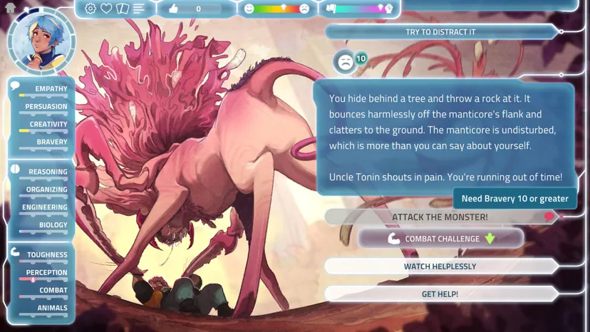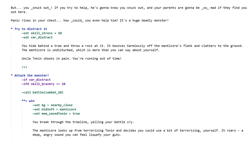 In this instance, selecting “Try to distract it” units an event-level variable (“~set var_distract”), then returns to the earlier checklist of selections whereas eradicating itself (“>>>”). This will reveal a brand new option to “Attack the monster!” now that you just’ve distracted it (“~if var_distract”), which triggers a card battle (“~call battle(combat_10)”). But it has a further bravery requirement (“~ifd skill_bravery >= 10”) which should even be met. If you win the battle, a brand new illustration will present (“~set bg = nearby_close”) and a everlasting variable will probably be set (“~set mem_savedTonin = true”) to recollect this for future occasions.