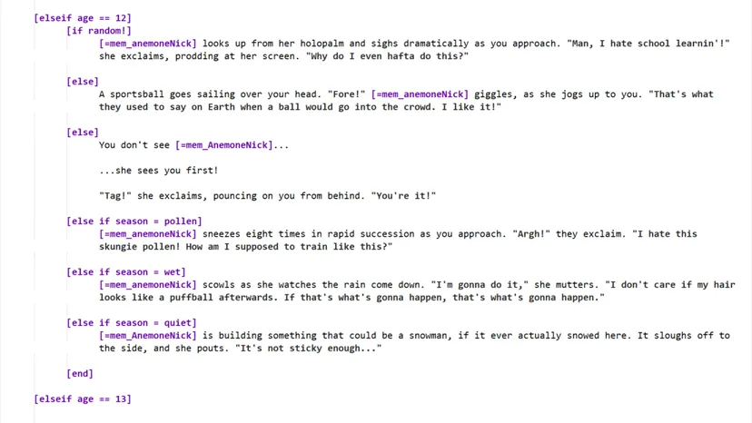 Our in-line conditionals (eg “[if skill_bravery >= 50] How brave you are! [else] Scaredy cat! [end]”) work like “~if” to find out which block of textual content to point out. We use them everywhere, however want to place them round full paragraphs. This is each simpler to learn, and if we ever resolve to localize someday it is going to make translators’ jobs simpler.